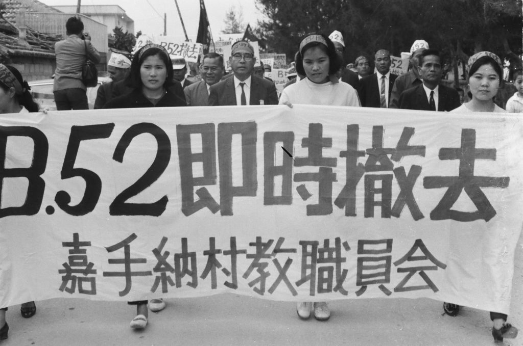 B52即時撤去を要求する決起大会 嘉手納村教職員会スト(大会) B52即時撤去を要求する決起大会 嘉手納村教職員会スト(大会) // 於:嘉手納総合グラウンド ID13141年月日1968年12月7日場所嘉手納町